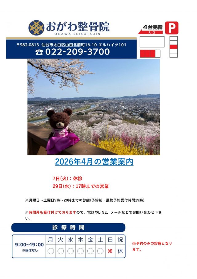 令和8年4月の営業案内 | 仙台市太白区で腰痛・骨盤矯正(歪み改善)が評判 | 口コミ多数の人気の整骨院|太白区おがわ整骨院